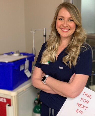Jessica: Part of my job as an ICU educator is finding areas where we can improve our nurses’ knowledge base and processes. As COVID-19 started to create more stressful conditions in our unit, I realized we needed a way to help keep the code team informed and those outside the room unexposed. Our ICU doors are glass, so I made laminated “Code Cards” with our most commonly coded medications and procedures. We hold up these communication cards to the glass to get important messages to the nurses and keep staff safe during code blues. About an hour after I had the idea for these cards, I had them laminated and ready for use in our ICU areas. I could not have made it happen without the collaborative efforts of our ICU nurses and managers. These cards are now maintained on our ICU code carts and the process for utilizing them has become much smoother and safer for those both inside and outside the room. I can definitely see these remaining useful for future patients and even beyond this pandemic.